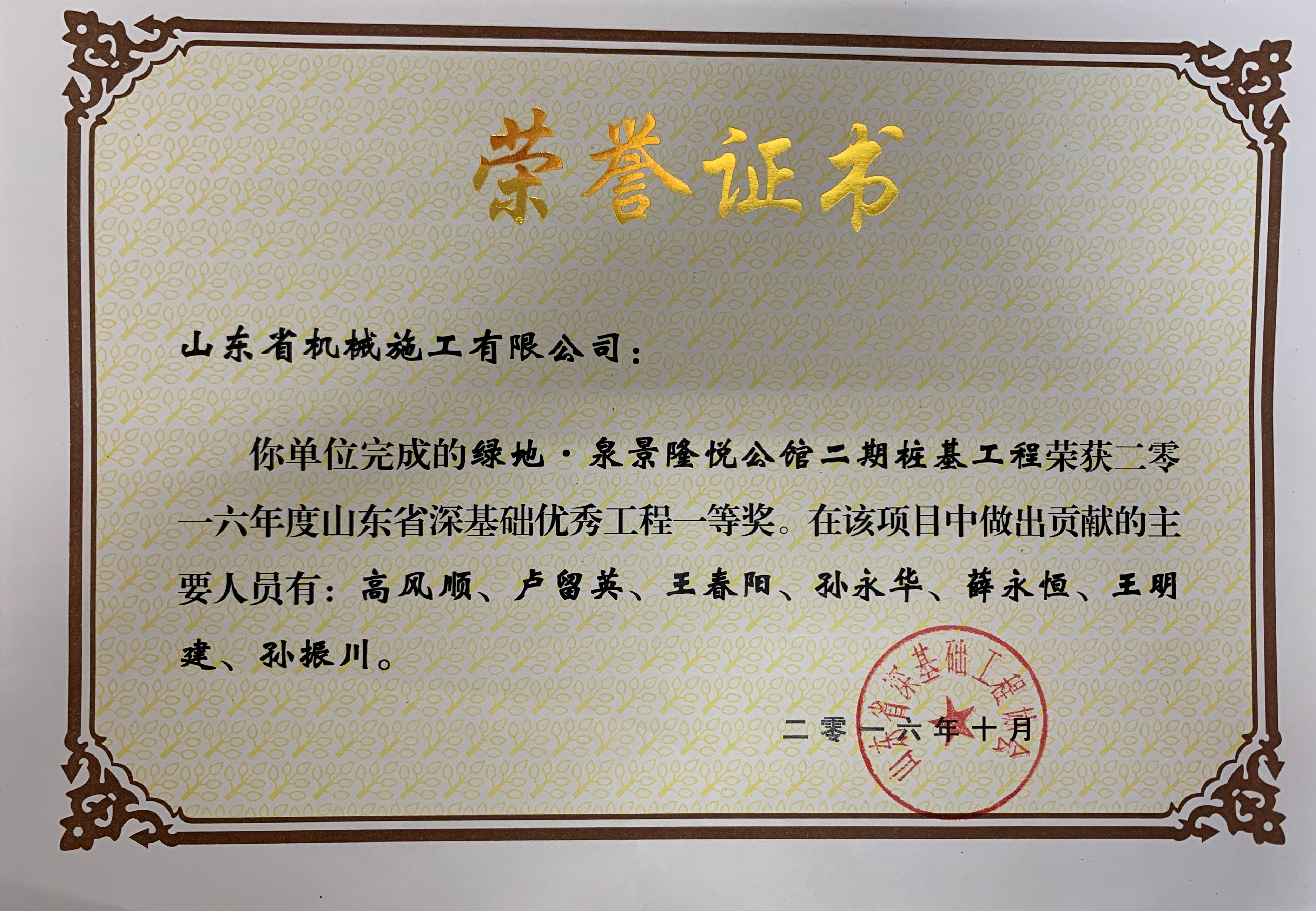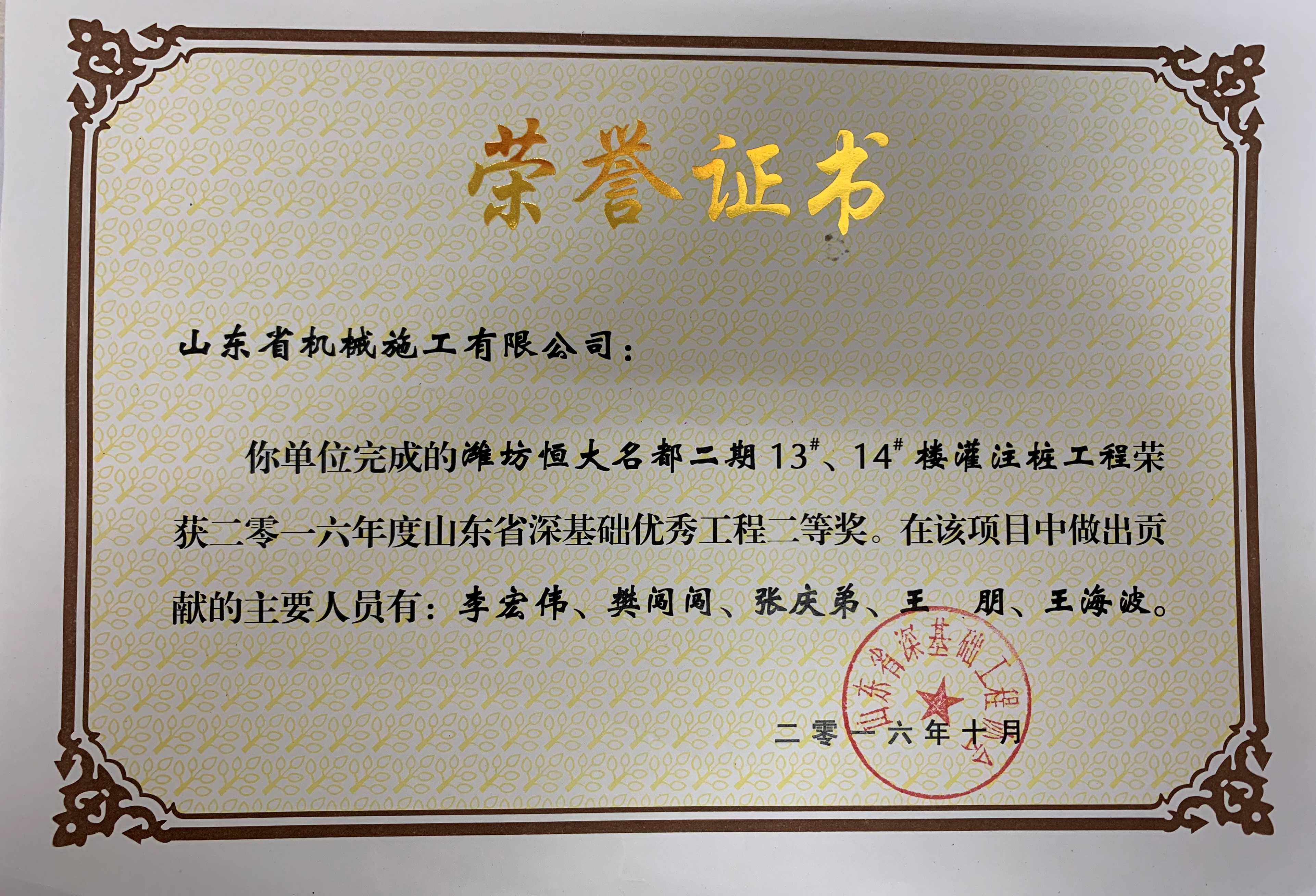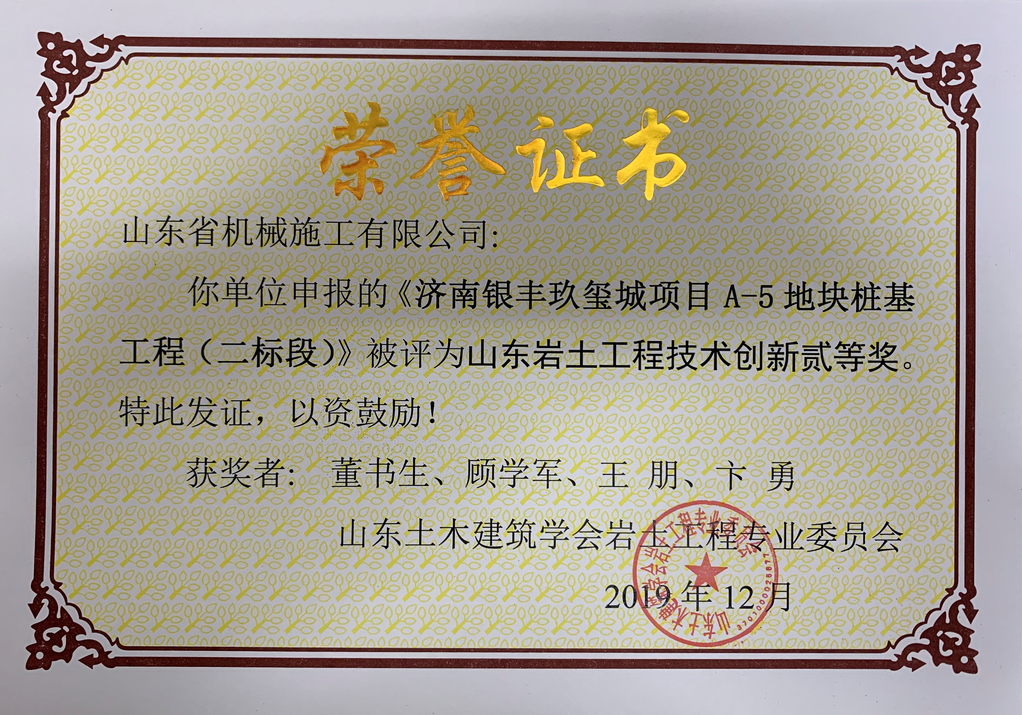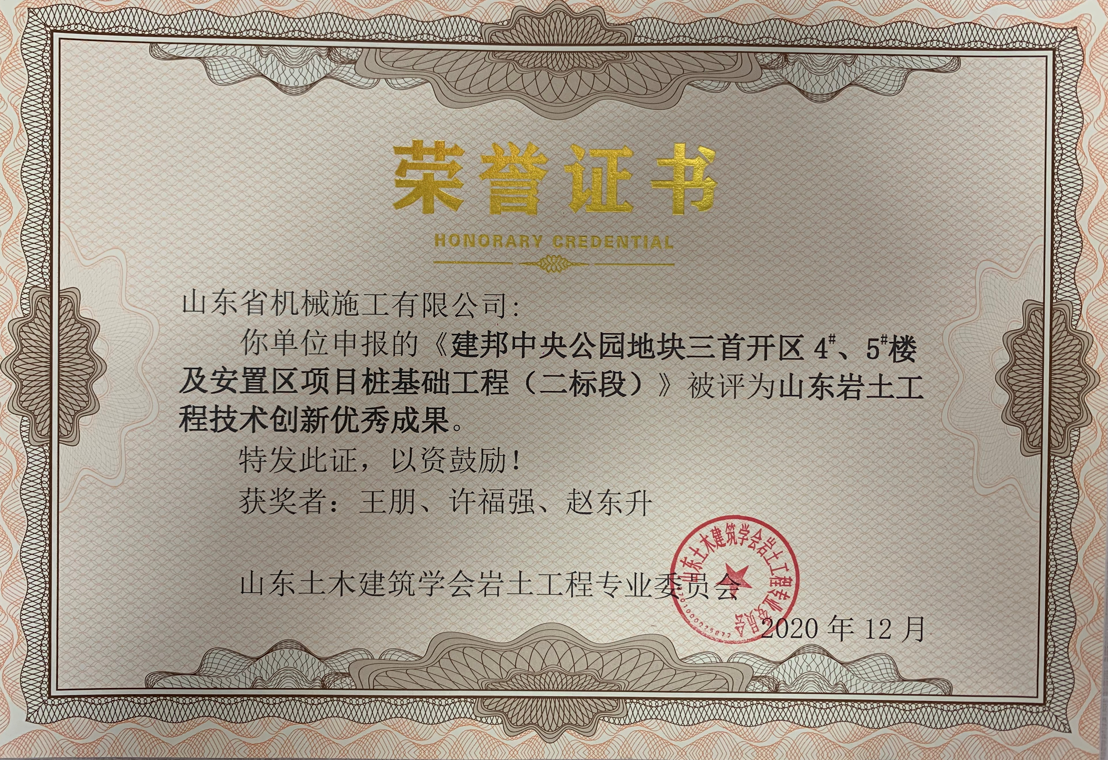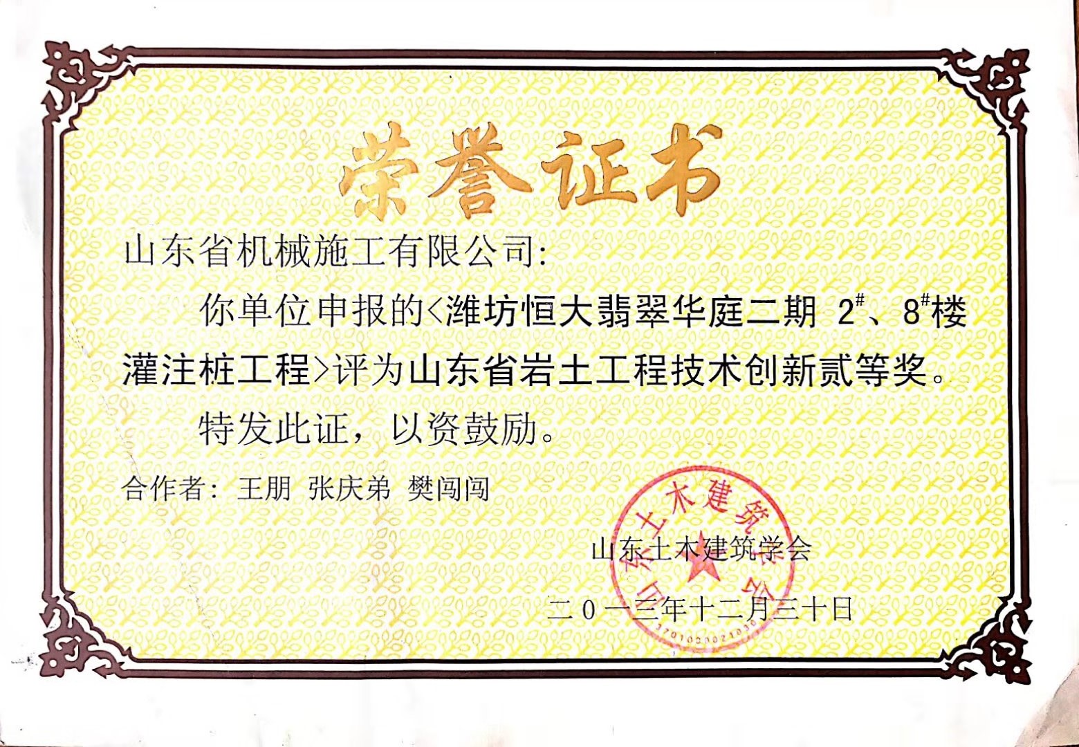 在王朋同(tóng)誌參與的眾多工程中,其中,菏澤恒大陽光半島項目樁基工程(chéng),完(wán)成產值約2430萬元;濟南平安(ān)金融中心(xīn)樁基工程,完成(chéng)產值約1500萬元,並榮(róng)獲欧美91av岩(yán)土工程(chéng)技術創新特等獎;菏澤建邦中央公園樁基工程,完成產值約900萬元,並榮獲欧美91av岩土工程技術創新優秀成果;欧美91av晉煤明(míng)化潔淨煤氣化項目管樁(zhuāng)工程,完成(chéng)產值735萬元;魯能領秀城抗浮(fú)錨杆工程,完成產值(zhí)約800萬元。綠地泉(quán)景隆悅公館榮(róng)獲欧美91av省深基礎優(yōu)秀工程一等獎;濰坊恒大名都工程榮獲欧美91av省深基礎優秀工程二(èr)等獎;濟南銀豐玖璽城項目、欧美91av晉煤明化樁基工程、濰坊翡翠(cuì)華庭(tíng)灌(guàn)注樁工程等(děng)多個(gè)項目(mù)被評為“欧美91av岩土工程技術創新”二等獎,參與(yǔ)編寫了“超大直徑嵌岩灌注樁多次成孔擴孔”施工工法,為公司(sī)創造了良好的經濟效益和社會效(xiào)益,贏得了建設單位(wèi)和公司(sī)領導的稱讚。